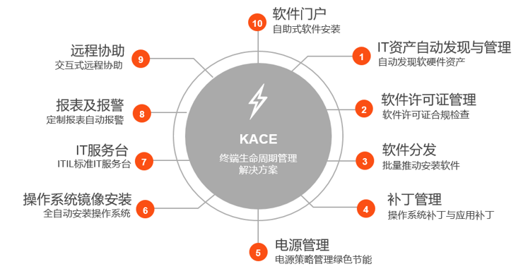 KACE System Management Appliance (KACE SMA)做系统管理, KACE System Deployment Appliance (KACE SDA)做系统部署,他们将协同工作,向客户提供的主要功能如下: