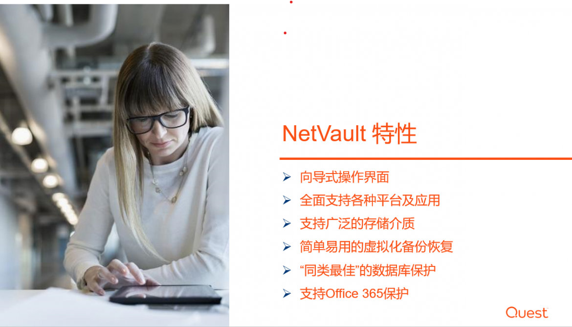 Quest® NetVault® Backup提供企业级的跨平台数据保护,它开箱即用而且使用方便,可以轻松扩展来满足数据增长需求,让快速增长的企业获益。