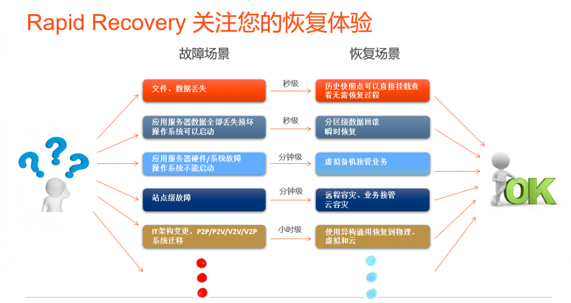 • 实时恢复 – Rapid Recovery 实时恢复是一种面向 VM 或服务器的即时恢复技术。通过该技术,可几乎不间断地访问虚拟服务器或物理服务器上的数据卷。在恢复整个卷时,可达到接近于零的 RTO 和仅需数分钟的 RPO。Rapid Recovery 备份和复制技术可记录多个 VM 或服务器的并发快照,提供近乎瞬时的数据和系统保护。您可以直接从备份文件恢复服务器的使用,无需等待生产存储完全还原。这样不仅可使用户保持生产效率,还能帮助 IT 部门缩短恢复时间,因而可满足当今日趋严格的 RTO 和 RPO 服务级别协议要求。
